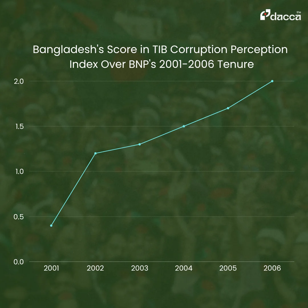 The Dacca টিম Transparency International এর ২০০১ থেকে ২০০৫ এর Corruption Perception Index র্যাংকিং ও সূচক সংগ্রহ করেছে। এক্ষেত্রে দেখা যায় যে ২০০১ সালে বাংলাদেশ এর স্কোর ছিল 10 এর মধ্যে 0.4 এবং বাংলাদেশ ৯১টি দেশের মধ্যে দুর্নীতিতে প্রথম হয়েছিল।